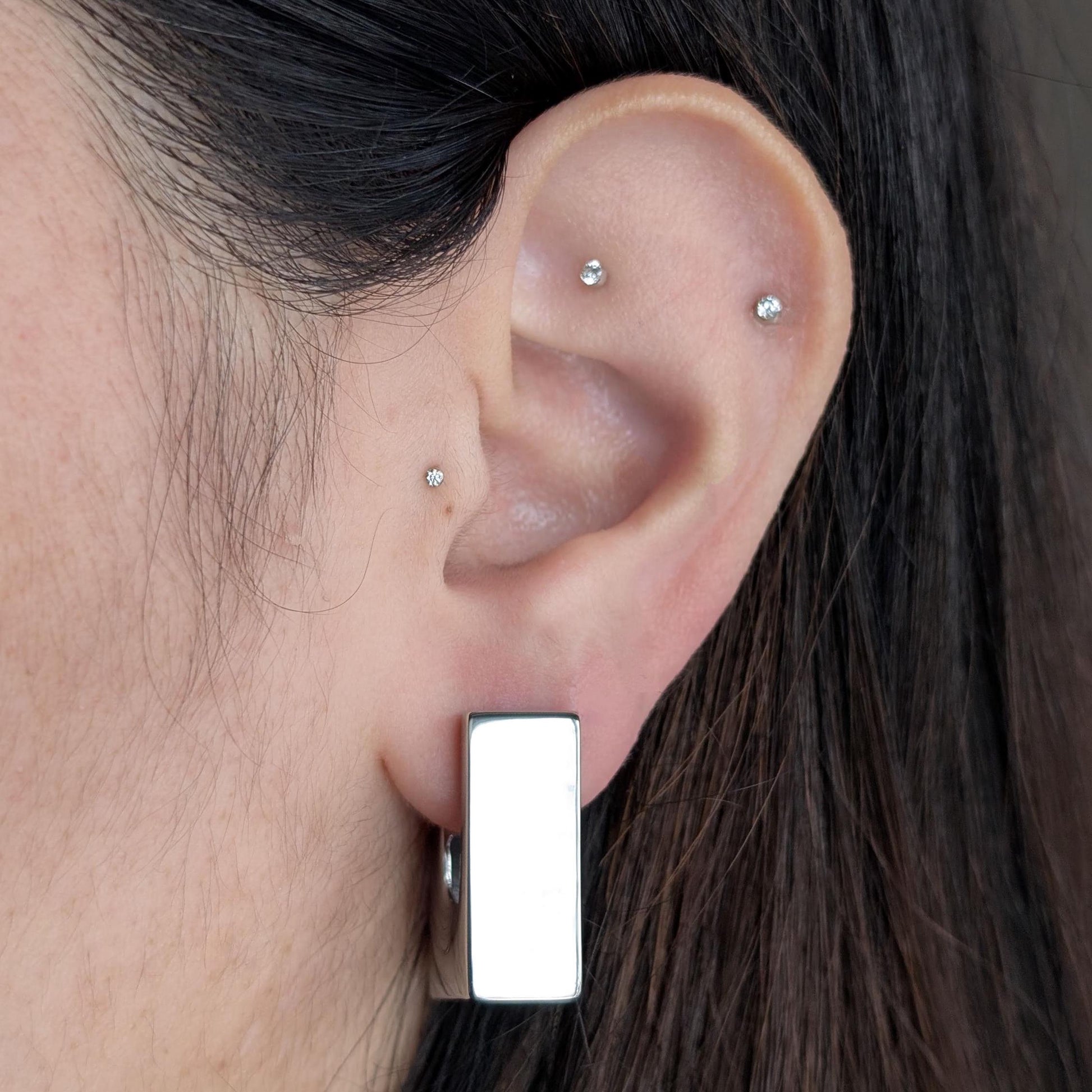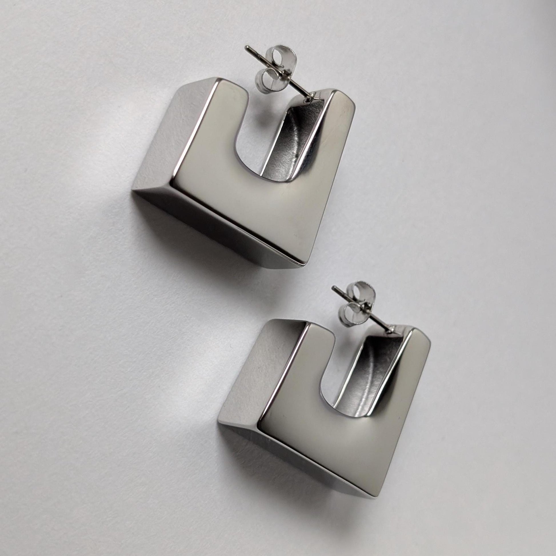 These statement earrings are the perfect geometrical shape that delivers a unique appearance from every angel. The square shape adds a different touch to the basic huggie hoop earrings. These provide dimension through it's flat reflective look.